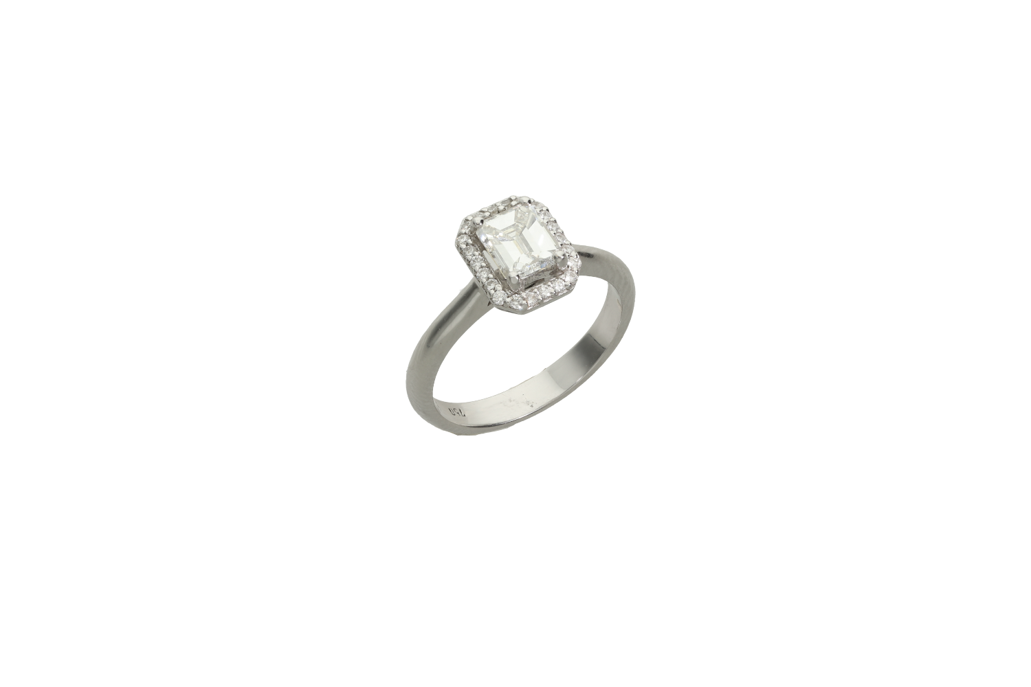 Δαχτυλίδι σε λευκόχρυσο 18Κ Μονόπετρο με γύρω μικρά διαμάντια και στο κέντρο ένα ορθογώνιο emerald cut διαμάντι