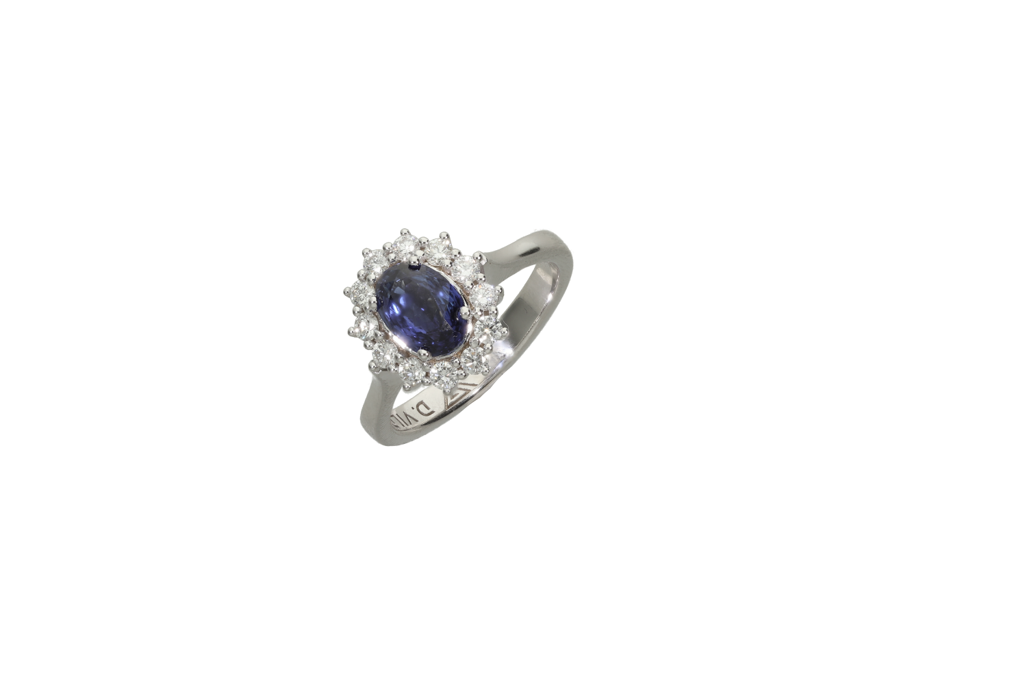 Δαχτυλίδι σε λευκόχρυσο 18Κ Ροζέτα με οβάλ Ζαφείρι 6/8χιλ και διαμάντια δεμένα με πέντε σύρματα.