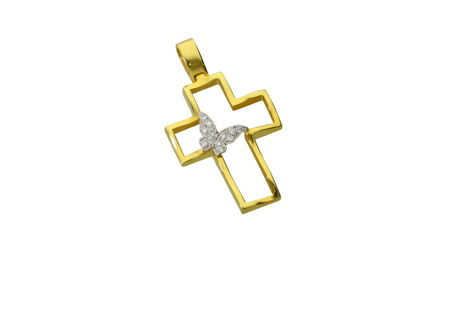 Σταυρός βαπτιστικός για κορίτσι σε χρυσό 14Κ, πλαίσιο με πεταλούδα και ζιργκόν |Βαπτιστικοί Σταυροί για Κορίτσι|Δημιουργικό Βιλδιρίδης|