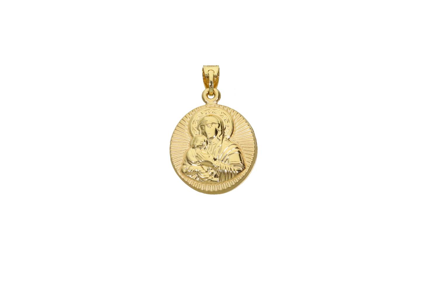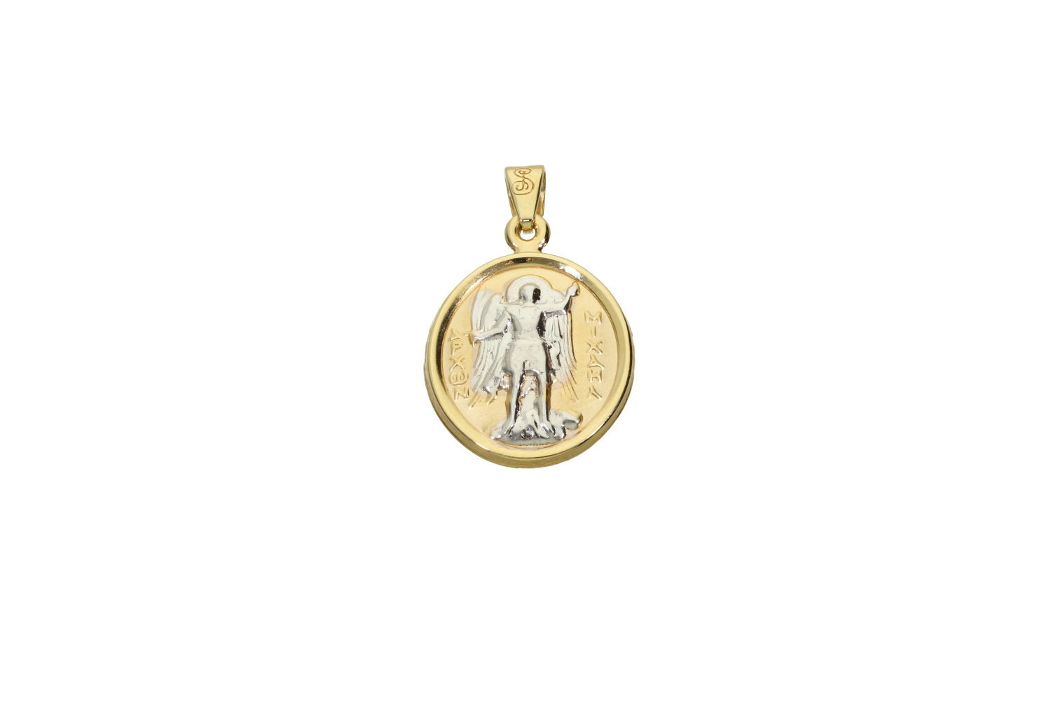 Φυλαχτό σε δίχρωμο χρυσό 14Κ από την μία πλευρά η Παναγία να κρατά τον Ιησού και από την άλλη ο Αρχάγγελος Μιχαηλ