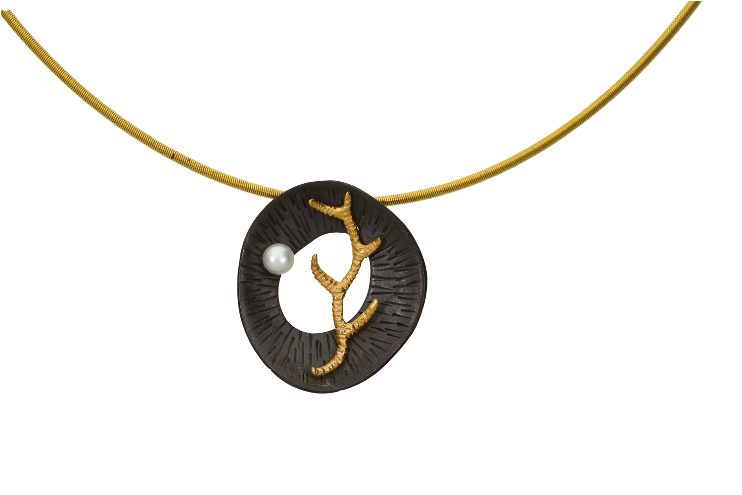 Κολιέ σε δίχρωμο ασήμι 925° μαυρισμένο κυκλικό μοτιφ με επιχρυσωμένο κλαδί και ένα μαργαριτάρι