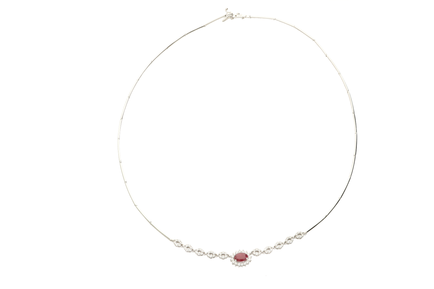 Κολιέ σε λευκόχρυσο 18K με Ροζέτα Οβάλ στο κέντρο και οβαλάκια με διαμάντια και ρουμπίνι.