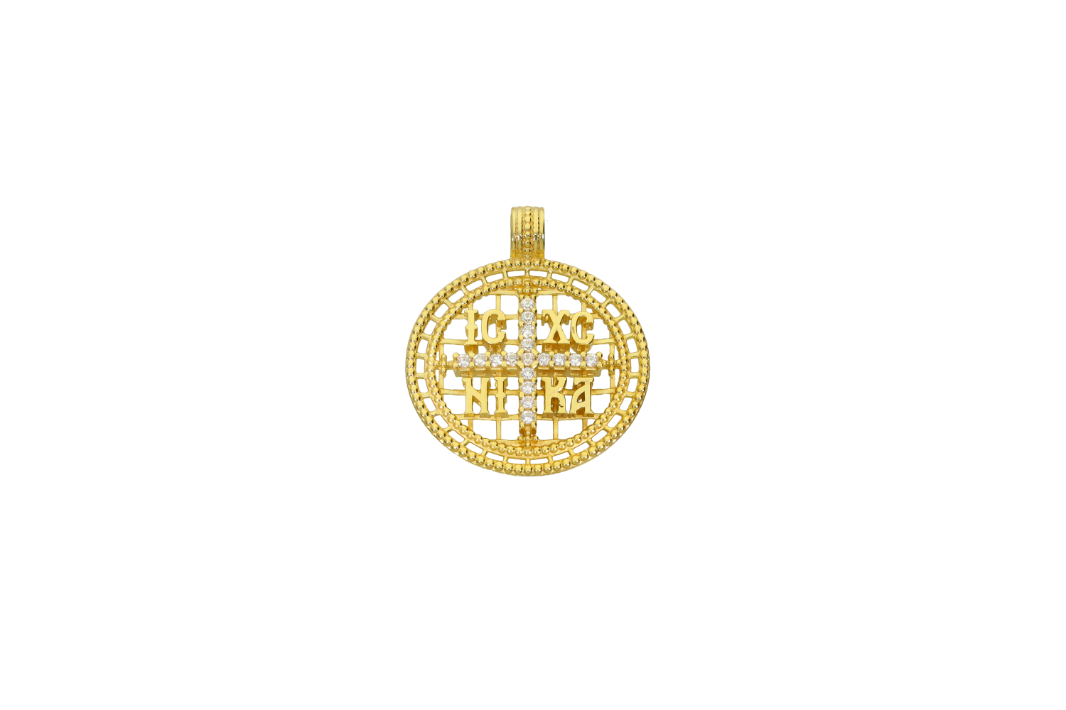 Κωνσταντινάτο σε χρυσό 14Κ στρογγυλό διάτρυτο με ανάγλυφο ICXCNIKA ζιργκόν σε σταυρό