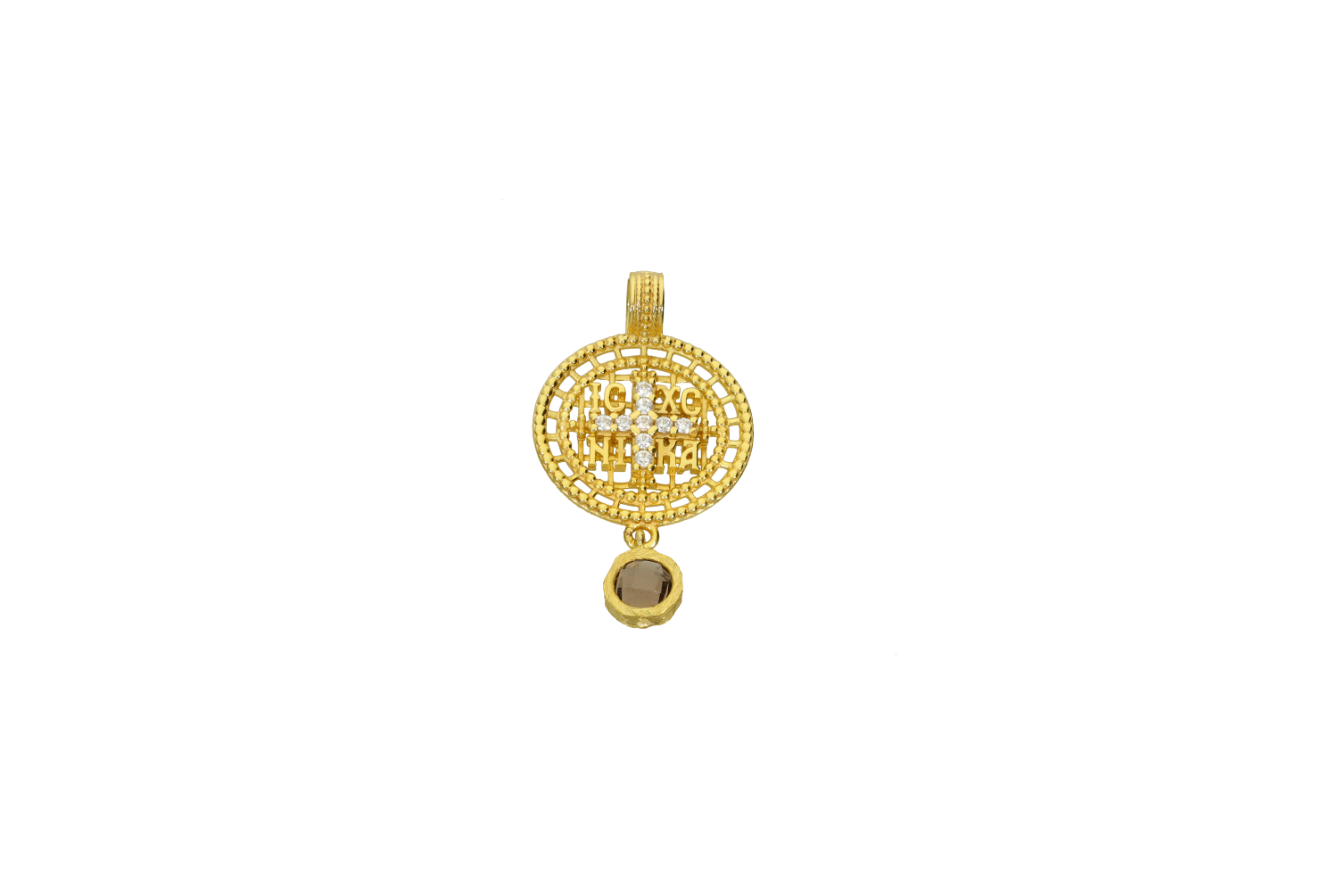 Κωνσταντινάτο σε χρυσό 14Κ στρογγυλό διάτρυτο με ανάγλυφο ICXCNIKA ζιργκόν σε σταυρό και ένα κρεμαστό ζιργκόν