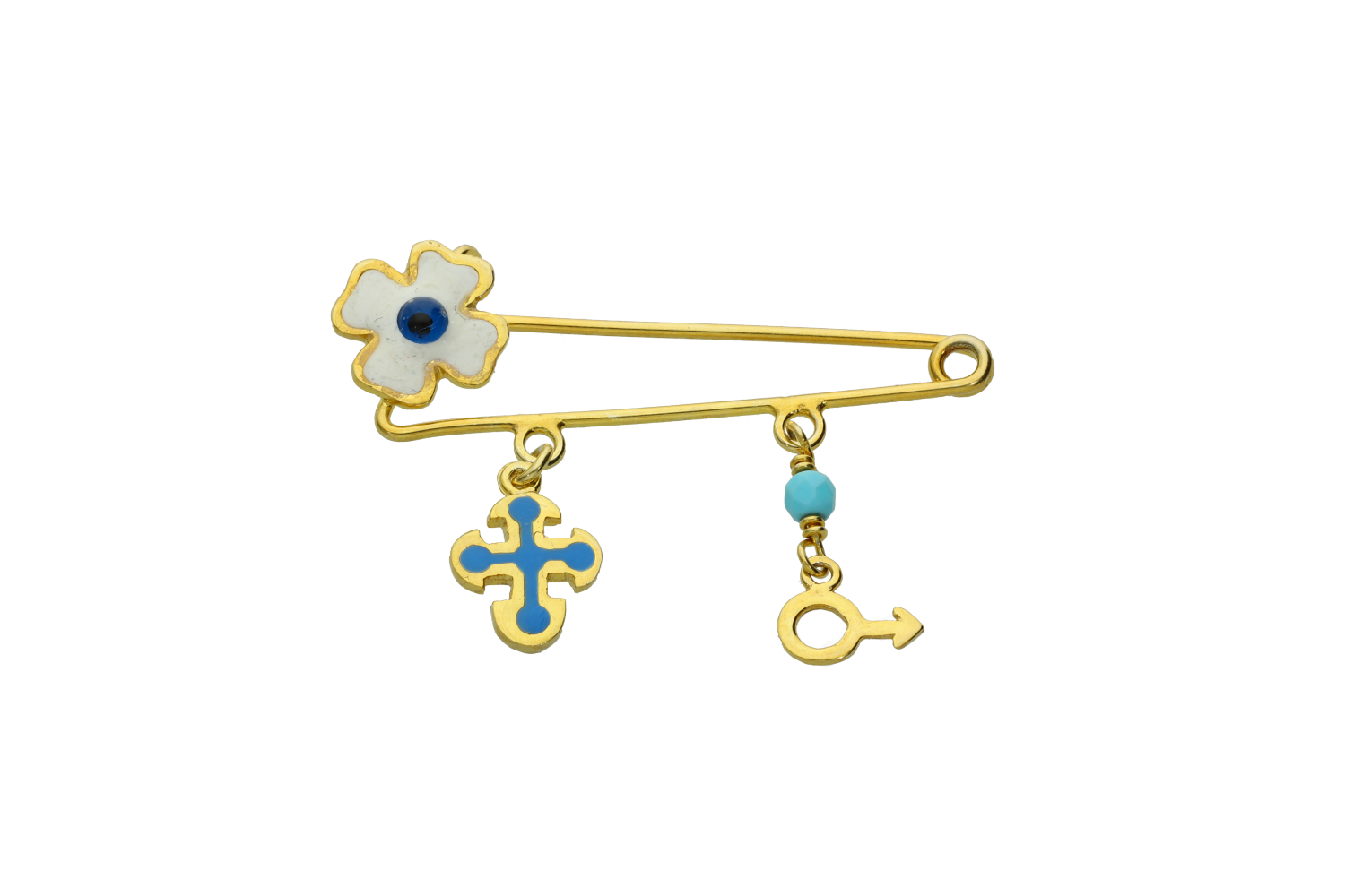 Παραμάνα παιδική για αγόρι σε ασήμι 925° επίχρυσο με δύο σταυρουδάκια το ένα από λευκό σμάλτο το άλλο κρεμαστό με μπλε σμάλτο και ένα ακόμα κρεμαστό με το σύμβολο του αγοριού