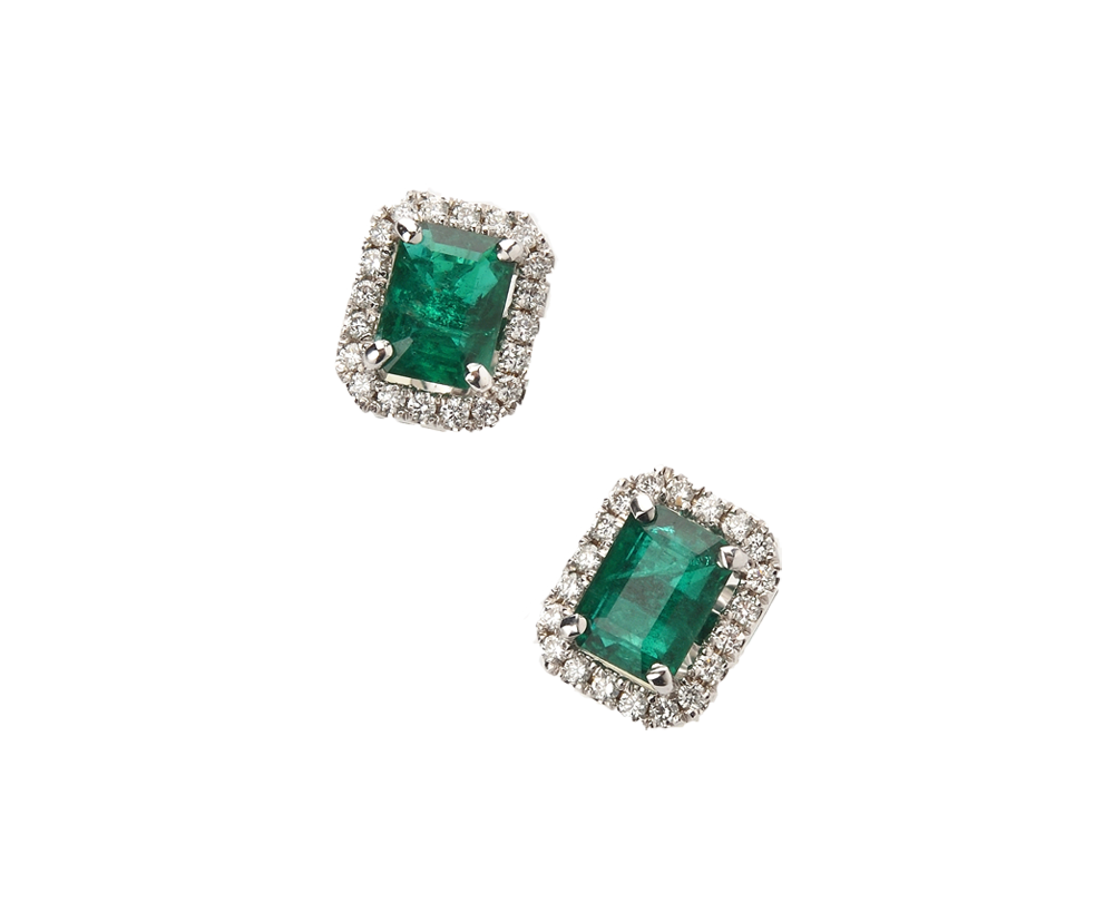 Σκουλαρίκια σε λευκόχρυσο 18Κ ορθογώνιες halo ροζέτες με γύρω διαμάντια και στο κέντρο ορθογώνια σμαράγδια.