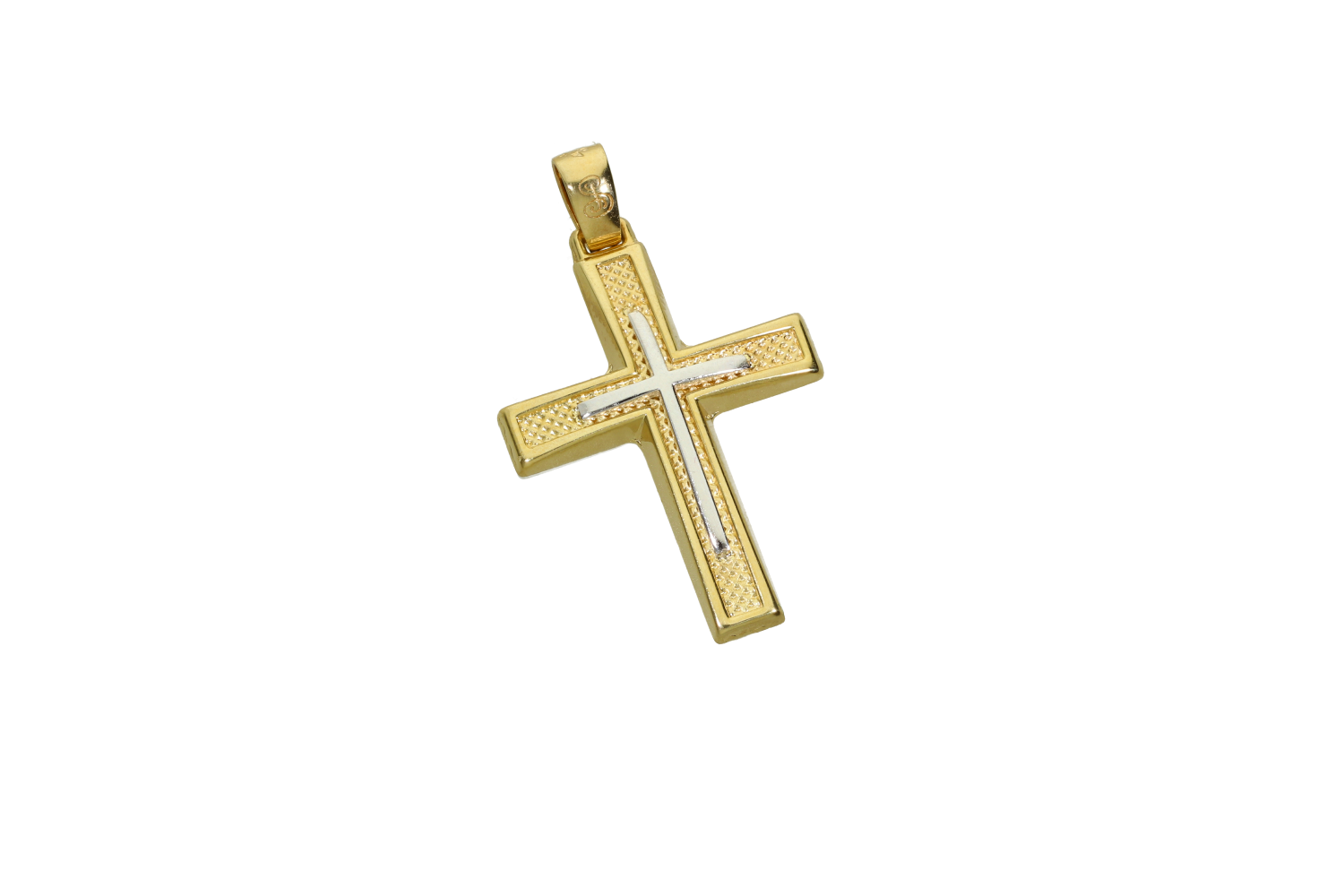 Σταυρός Βάπτισης για αγόρι σε δίχρωμο χρυσό 9Κ με κυψελωτό εφέ και ένας μικρότερος λευκός από επάνω